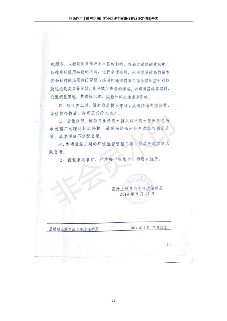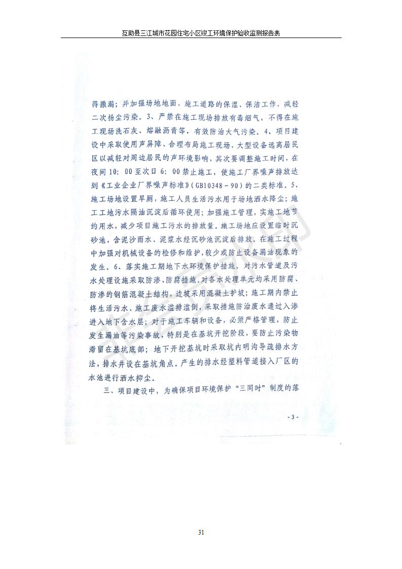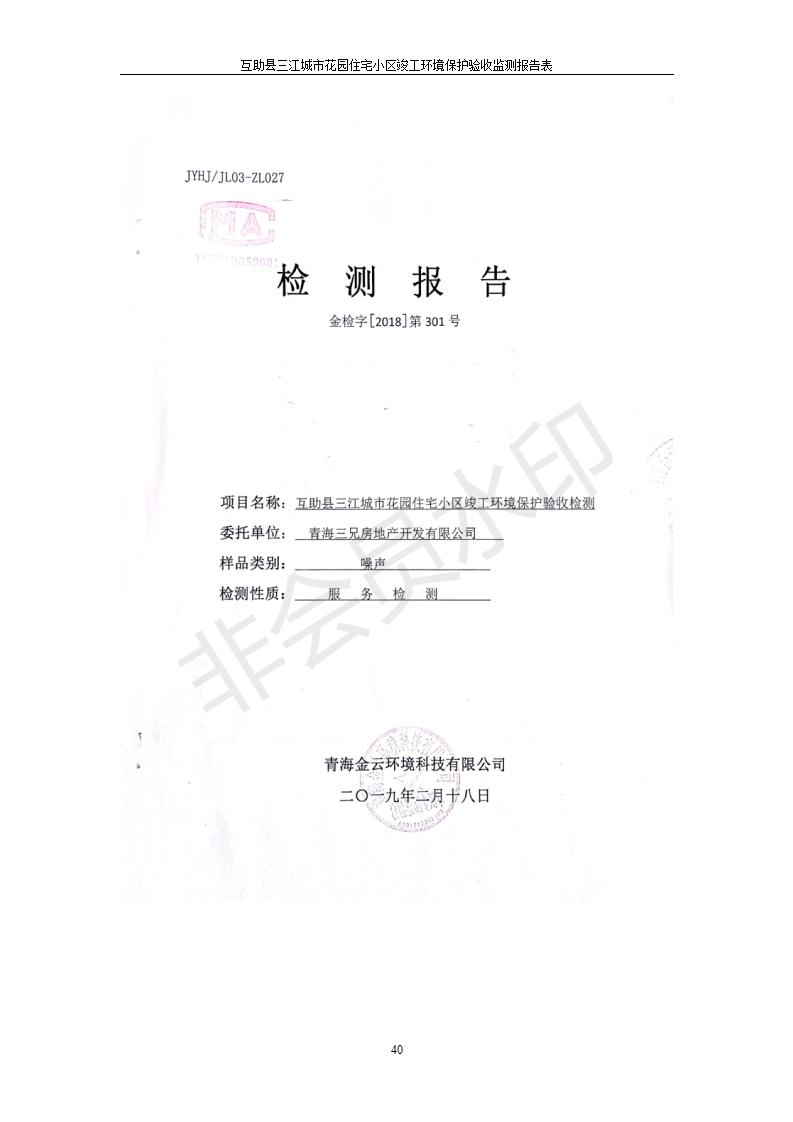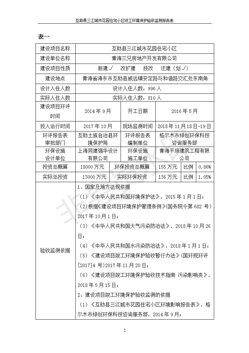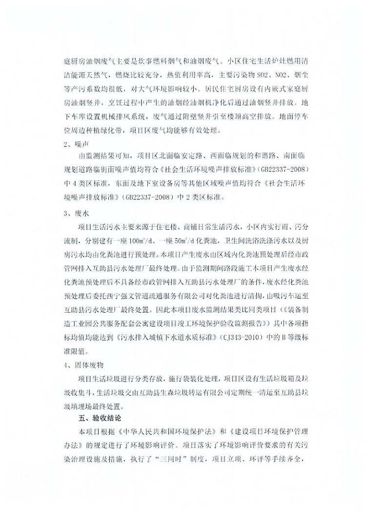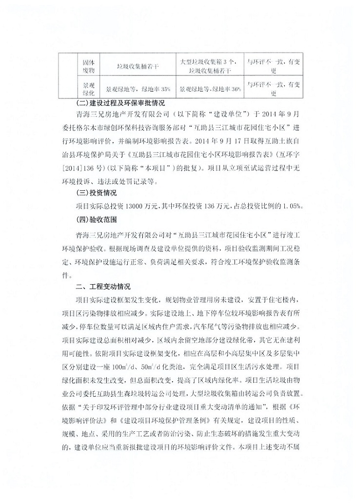 根據(jù)中華人民共和國國務院令第682號《國務院關于修改〈建設項目環(huán)境保護管理條例〉的決定》和《建設項目竣工環(huán)境保護驗收暫行辦法》(國務院令682號),互助縣三江城市花園住宅小區(qū)(包括竣工環(huán)境保護驗收監(jiān)測報告表和驗收意見)公示如下。 一、項目名稱: 互助縣三江城市花園住宅小區(qū)竣工環(huán)境保護驗收監(jiān)測報告表 二、地點:青海省海東市互助土族自治縣威遠鎮(zhèn)安定路與和諧路交匯處東南角 三、建設單位:青海三兄房地產(chǎn)開發(fā)有限公司 四、建設內(nèi)容:項目規(guī)劃用地面積26670.0m2,實際占地面積26670.0m2,項目占地面積未發(fā)生變化,規(guī)劃設計建筑總面積76616.4m2,其中商業(yè)建筑面積8994m2。實際建筑總面積58639.64m2,其中商業(yè)建筑面積9894.27m2。 五、聯(lián)系人:張工 六、聯(lián)系電 話:0971-6515411 七、公示時間:二〇一九年六月五日至二〇一九年七月三日 公示期間,對上述公示內(nèi)容如有異議,請以書面形式反饋,個人須署真實姓名,單位須加蓋公章。