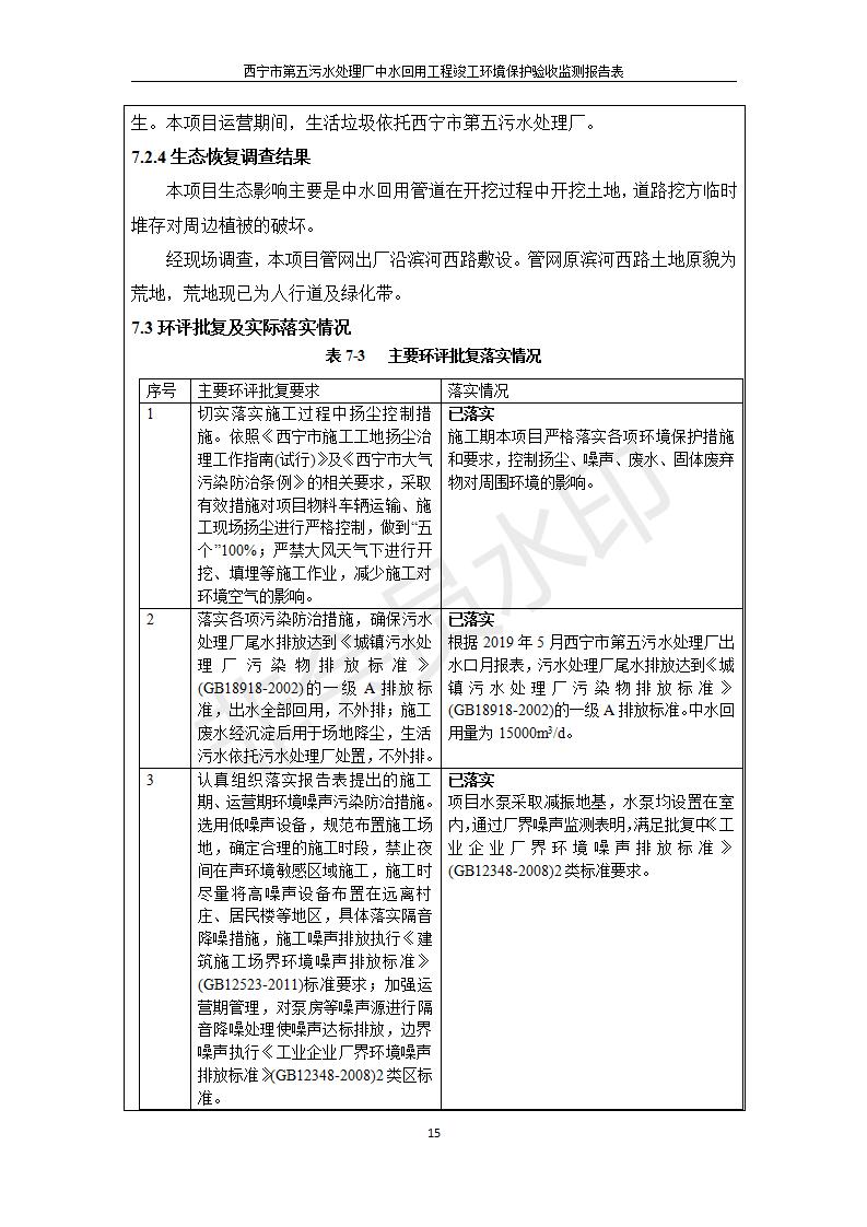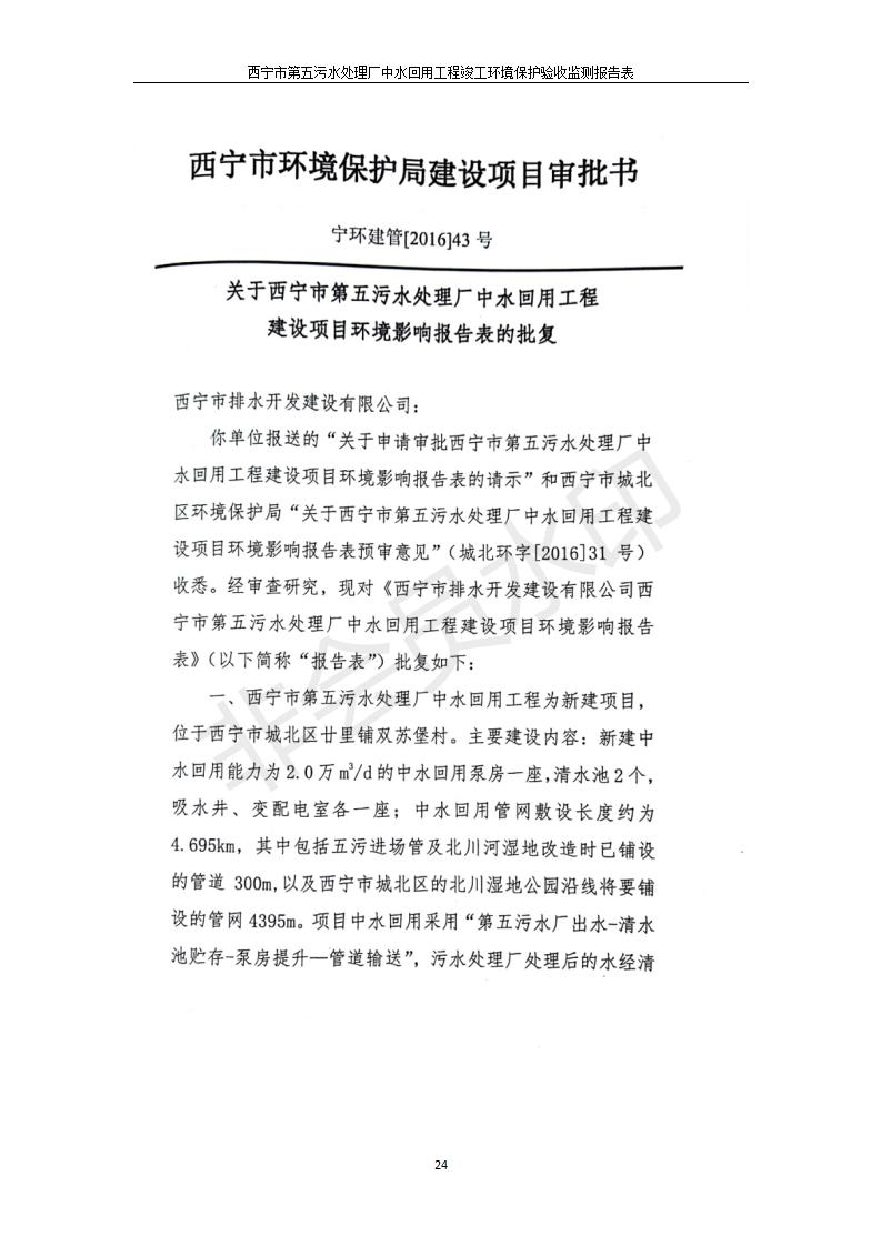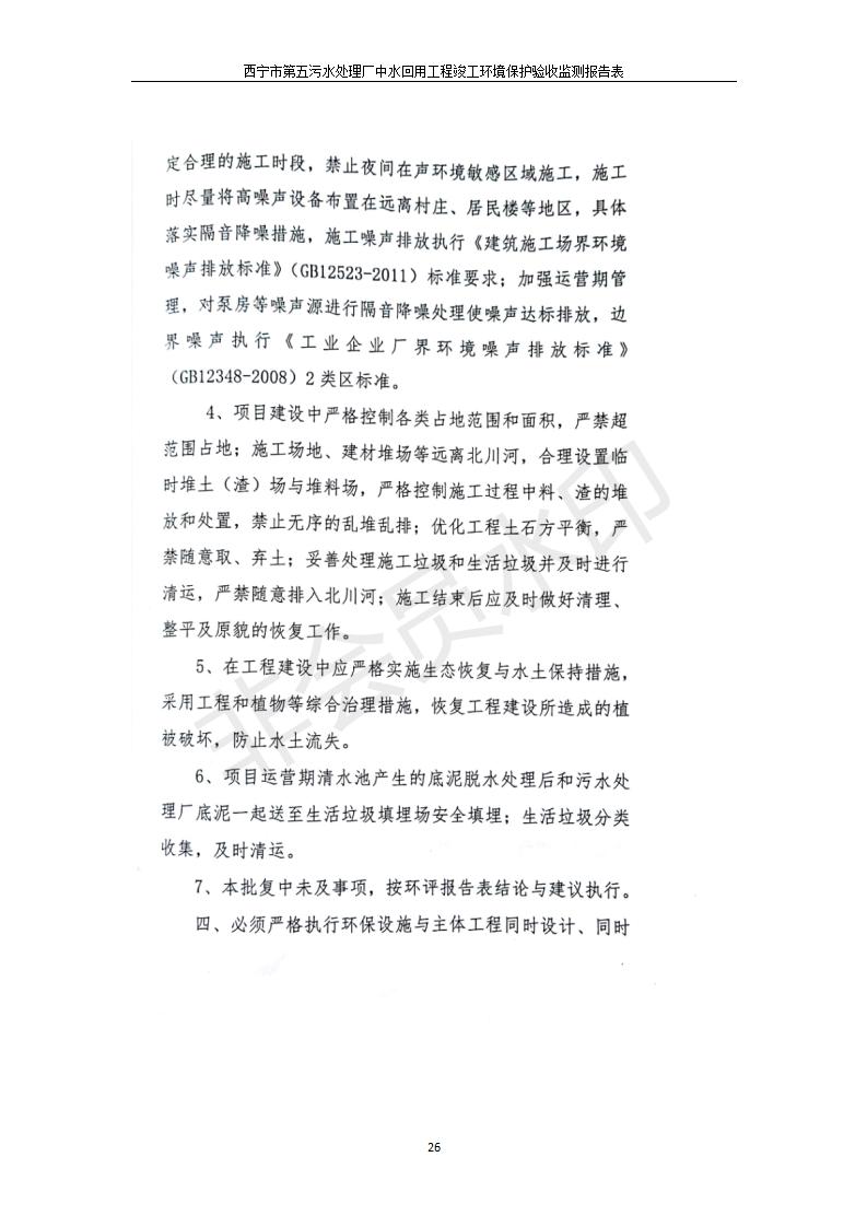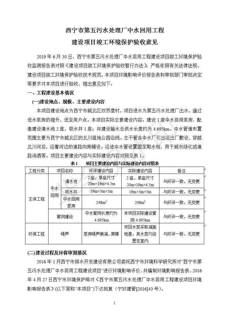 根據(jù)中華人民共和國國務院令第682號《國務院關于修改〈建設項目環(huán)境保護管理條例〉的決定》和《建設項目竣工環(huán)境保護驗收暫行辦法》(國務院令682號),西寧市第五污水處理廠中水回用工程建設項目(包括竣工環(huán)境保護驗收監(jiān)測報告表和驗收意見)公示如下。 一、項目名稱:西寧市第五污水處理廠中水回用工程建設項目 二、地點:西寧市城北區(qū)廿十里鋪雙蘇堡 三、建設單位:西寧市排水開發(fā)建設有限公司