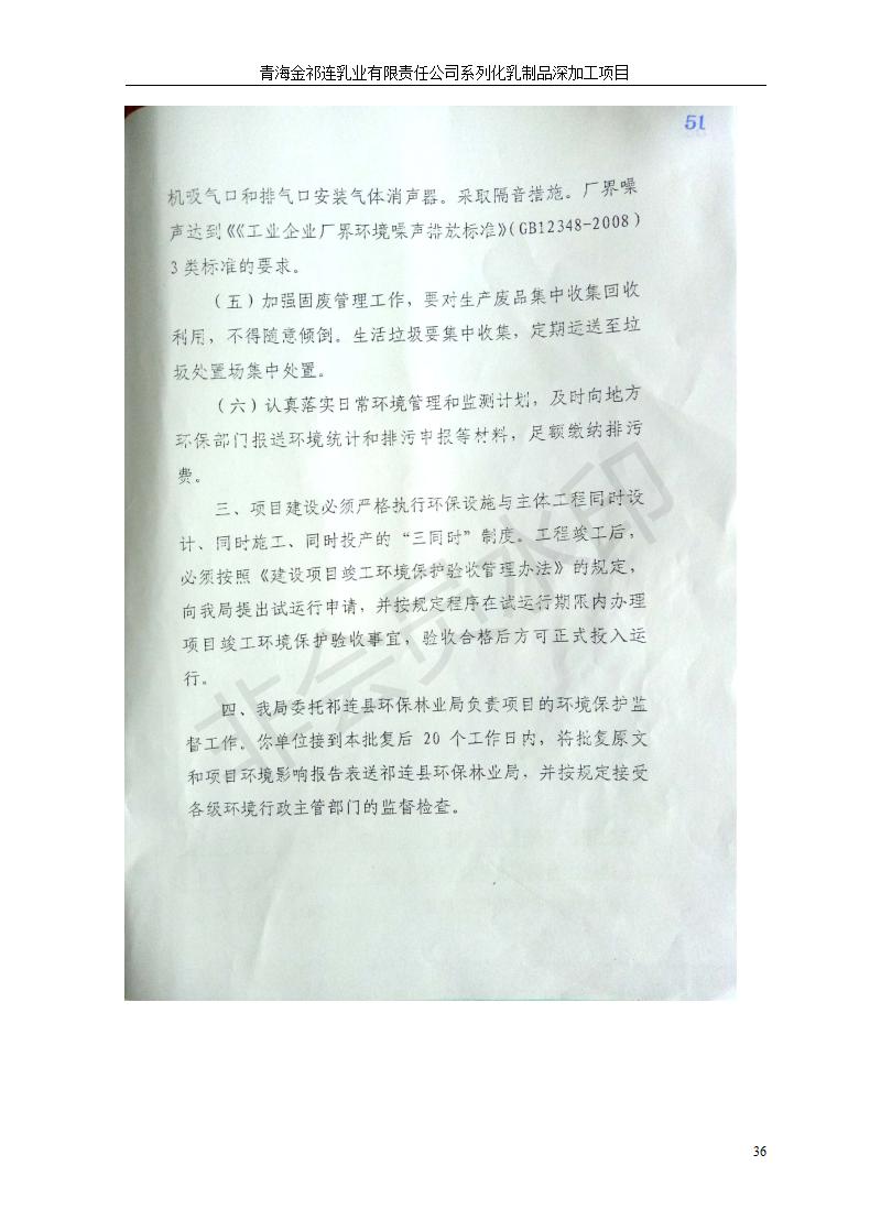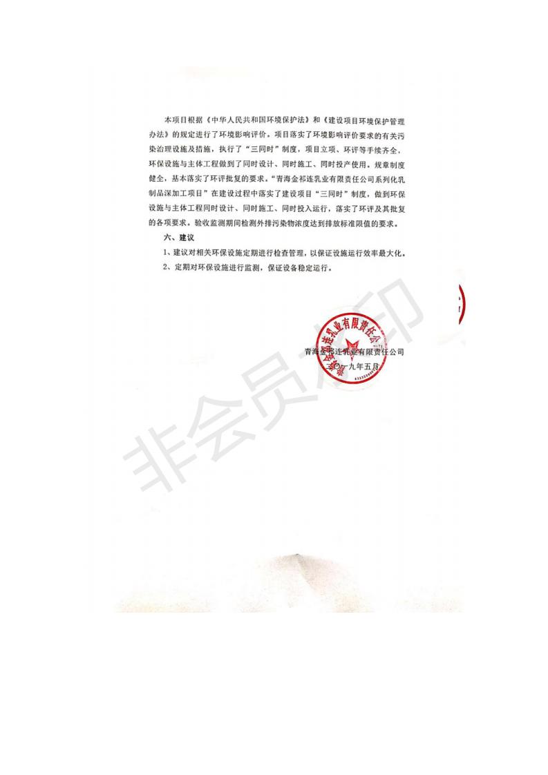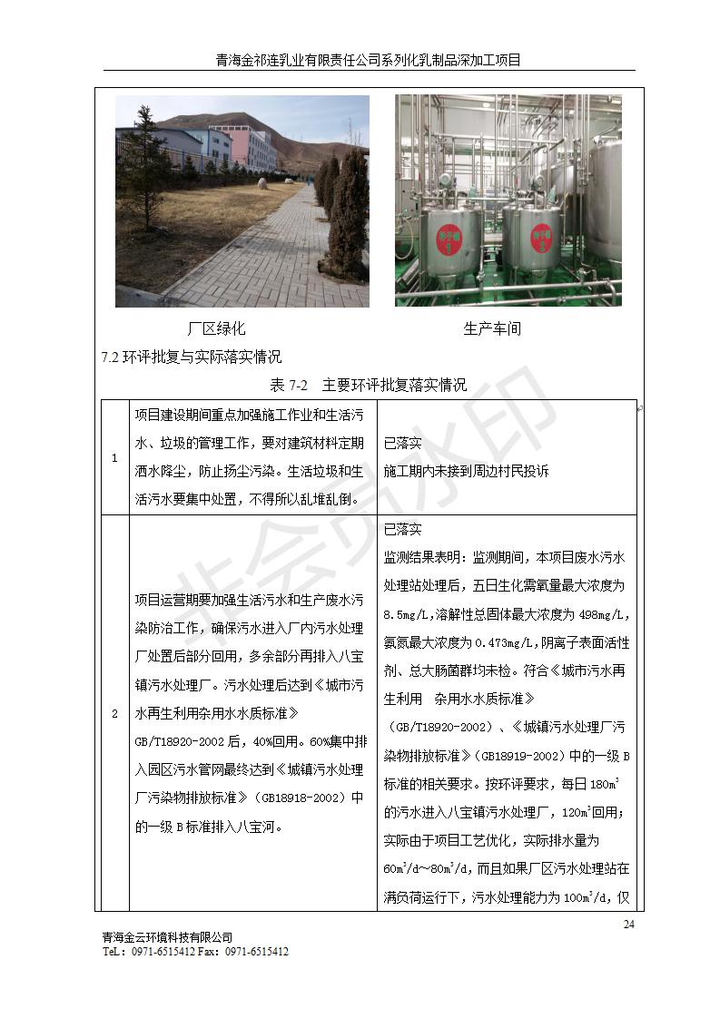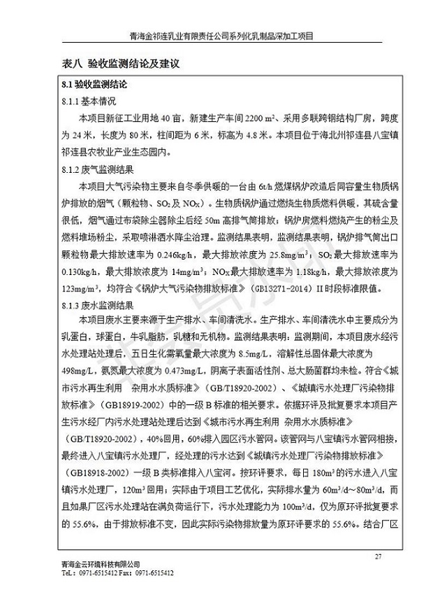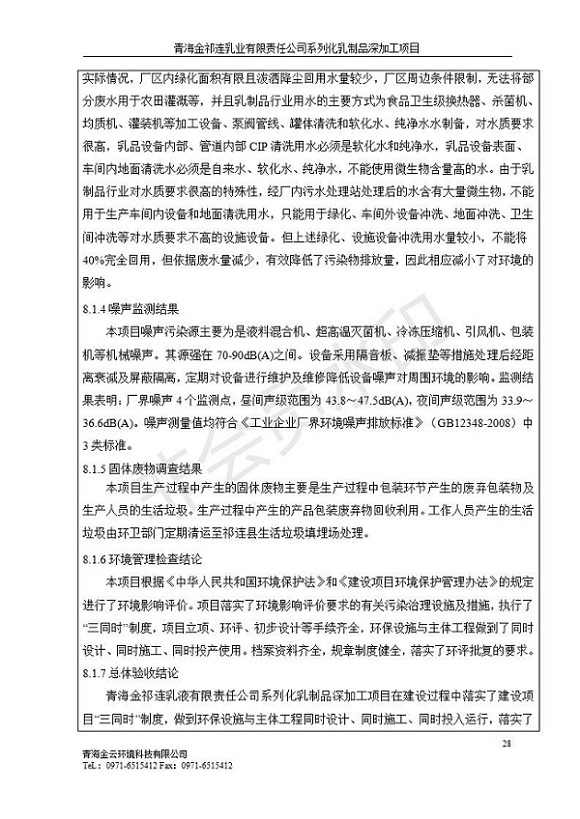 根據(jù)中華人民共和國國務(wù)院令第682號(hào)《國務(wù)院關(guān)于修改〈建設(shè)項(xiàng)目環(huán)境保護(hù)管理?xiàng)l例〉的決定》和《建設(shè)項(xiàng)目竣工環(huán)境保護(hù)驗(yàn)收暫行辦法》(國務(wù)院令682號(hào)),青海金祁連乳業(yè)有限責(zé)任公司系列化乳制品深加工項(xiàng)目(包括竣工環(huán)境保護(hù)驗(yàn)收監(jiān)測(cè)報(bào)告表和驗(yàn)收意見)公示如下。 一、項(xiàng)目名稱:青海金祁連乳業(yè)有限責(zé)任公司系列化乳制品深加工項(xiàng)目 二、地點(diǎn):海北藏族自治州祁連縣冰溝農(nóng)牧產(chǎn)業(yè)化生態(tài)園區(qū) 三、建設(shè)單位:青海金祁連乳業(yè)有限責(zé)任公司 四、建設(shè)內(nèi)容:本項(xiàng)目新征工業(yè)用地40畝,新建生產(chǎn)車間2200 m2、采用多聯(lián)跨鋼結(jié)構(gòu)廠房,跨度為24米,長(zhǎng)度為80米,柱間距為6米,標(biāo)高為4.8米。廠房?jī)?nèi)部根據(jù)產(chǎn)品生產(chǎn)工藝及工序要求分為不同的工作區(qū)域和車間辦公室。建設(shè)有保鮮冷庫800 m2、普通倉庫500m2、污水處理站房160 m2、鍋爐房和配電室159 m2、綜合辦公樓1200 m2、職工食堂和宿舍500 m2、其他輔助用房35 m2、蓄水池100 m2以及與土建工程相關(guān)聯(lián)的水、電、熱官網(wǎng)等輔助設(shè)施。 五、聯(lián)系人:張工 六、聯(lián)系電 話:0971-6515411 七、公示時(shí)間:二〇一九年七月十日至二〇一九年八月六日 公示期間,對(duì)上述公示內(nèi)容如有異議,請(qǐng)以書面形式反饋,個(gè)人須署真實(shí)姓名,單位須加蓋公章。