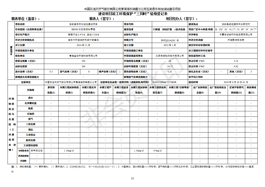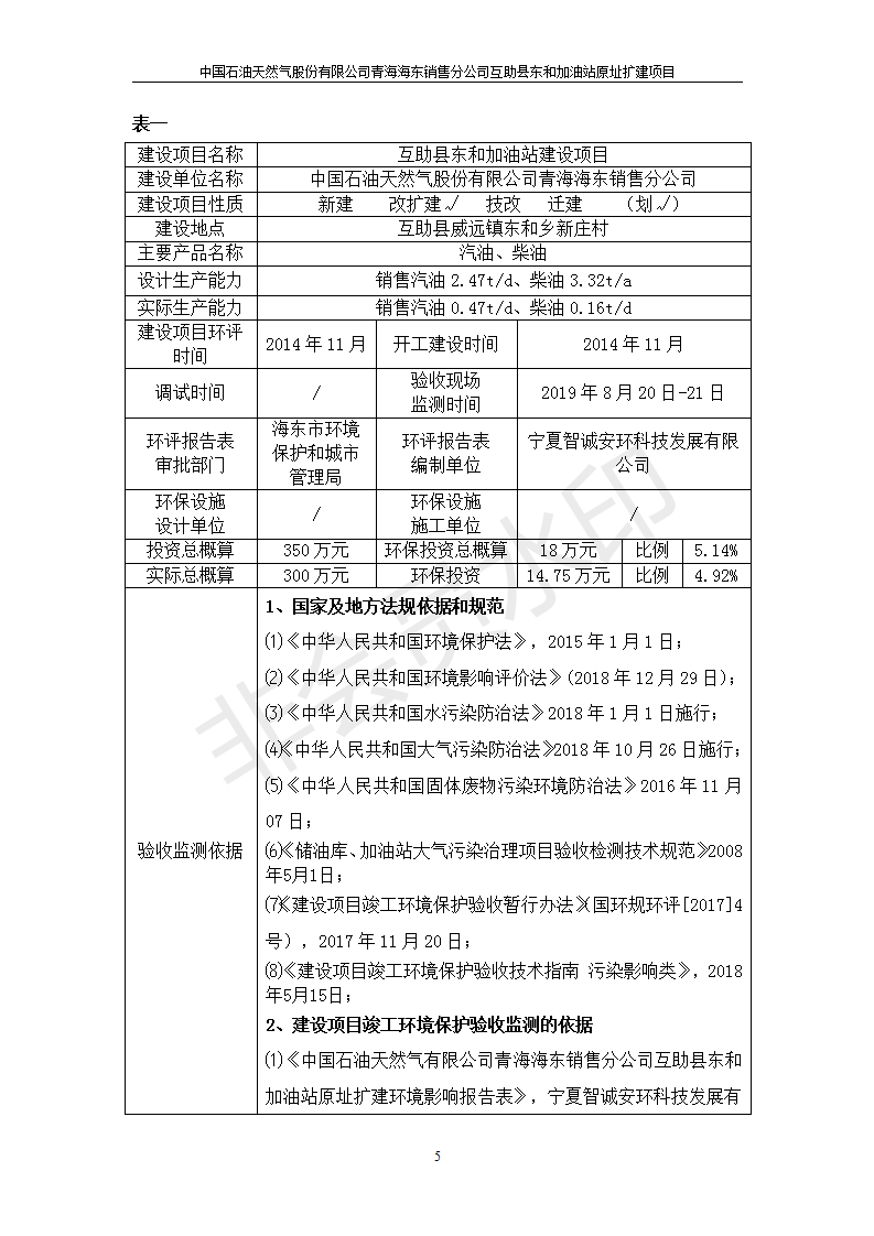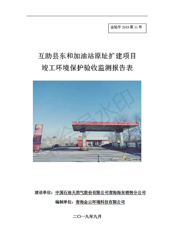 互助縣東和加油站原址擴建項目 竣工環(huán)境保護驗收監(jiān)測報告表公示發(fā)布日期:(2019-9-27) 點擊次數(shù):2541 |